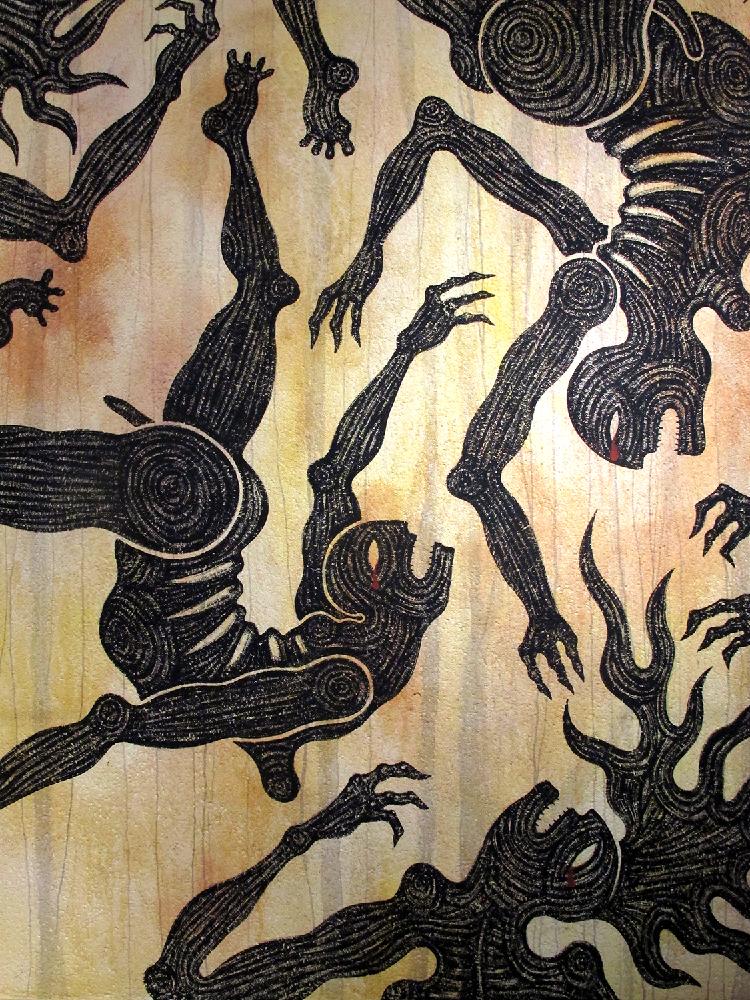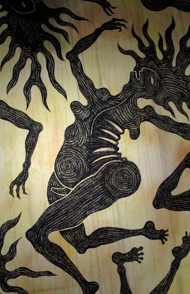 Avec le soutien du CROUS de Lyon, Catherine Ursin a ouvert sa résidence en réalisant la fresque, Sans Titre, au Resto’ U de la Manufacture des Tabacs. Intrigants, perturbants, ces corps polygenres en suspension soulèvent de multiples interrogations auprès du public. Leur curiosité encourage leur regard à scruter le pilier couvert d’inscriptions.