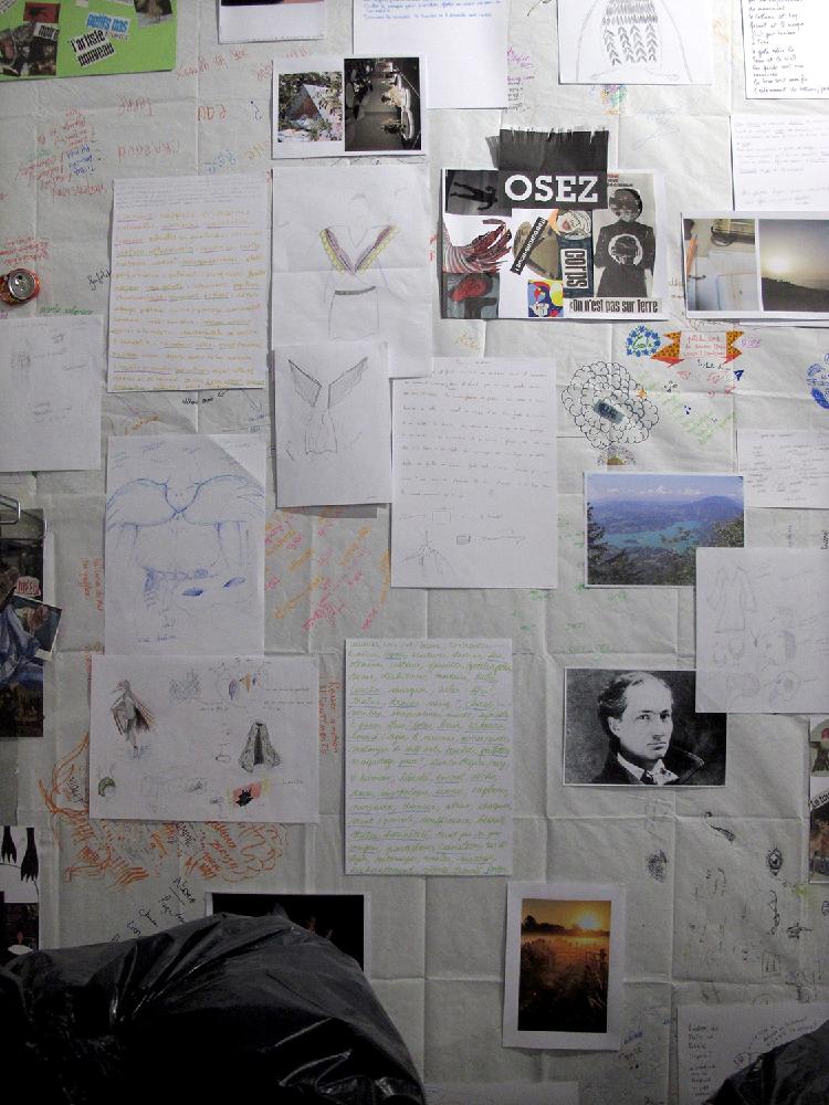 La salle devient un lieu d’exposition et de travail, en mouvement et changement perpétuels, s’agrémentant au fur et à mesure de nouvelles ?uvres, de croquis, de textes, de vie…