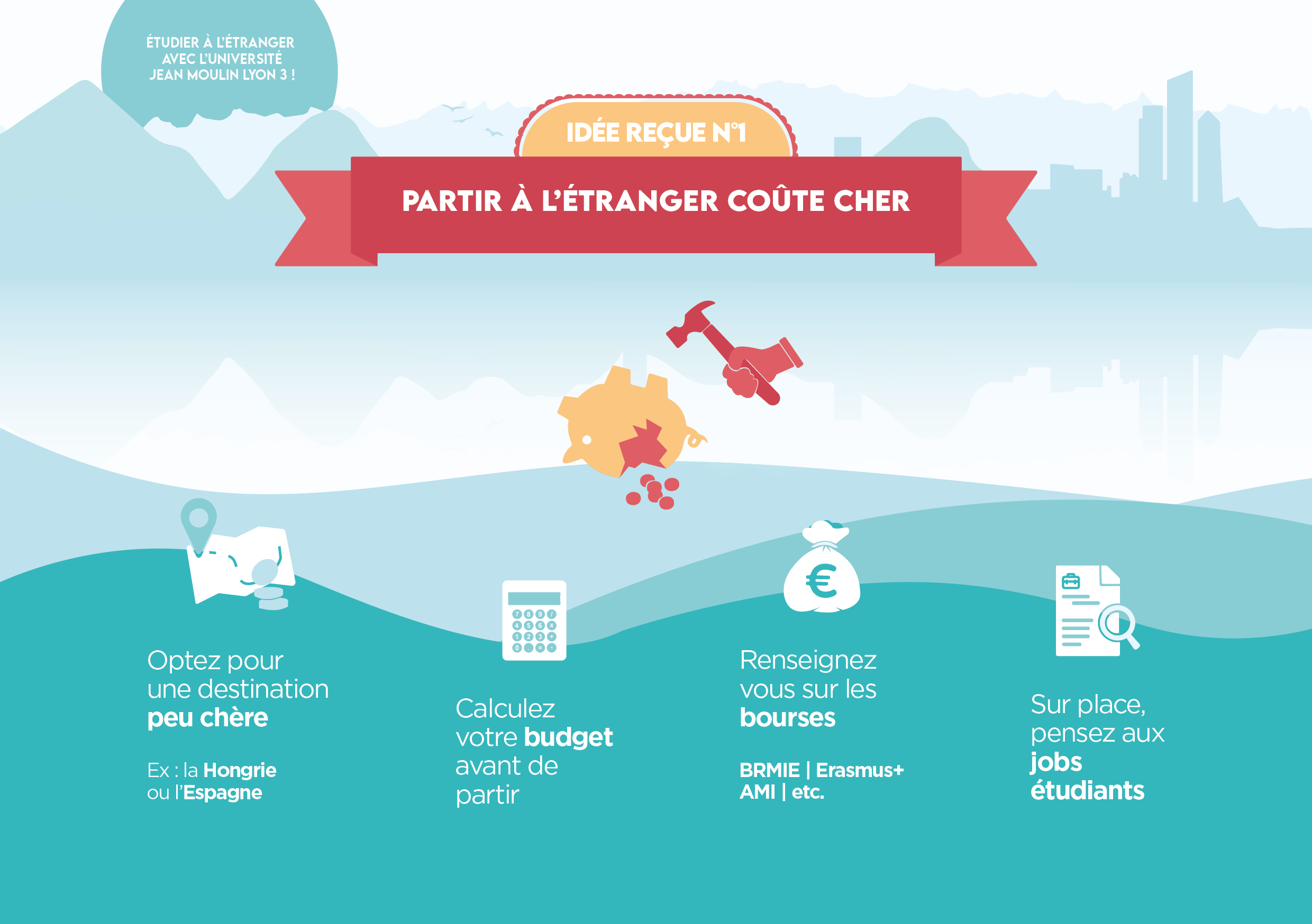 Ne laissez surtout pas vos craintes et vos peurs vous freiner dans votre projet. Budget, notes, éloignement, candidature … découvrez comment vous préparer à toutes ces étapes gr?ce à nos conseils avisés. Désormais, rien ne pourra vous arrêter.Idée re?ue n°1 : Partir à l'étranger co?te cher