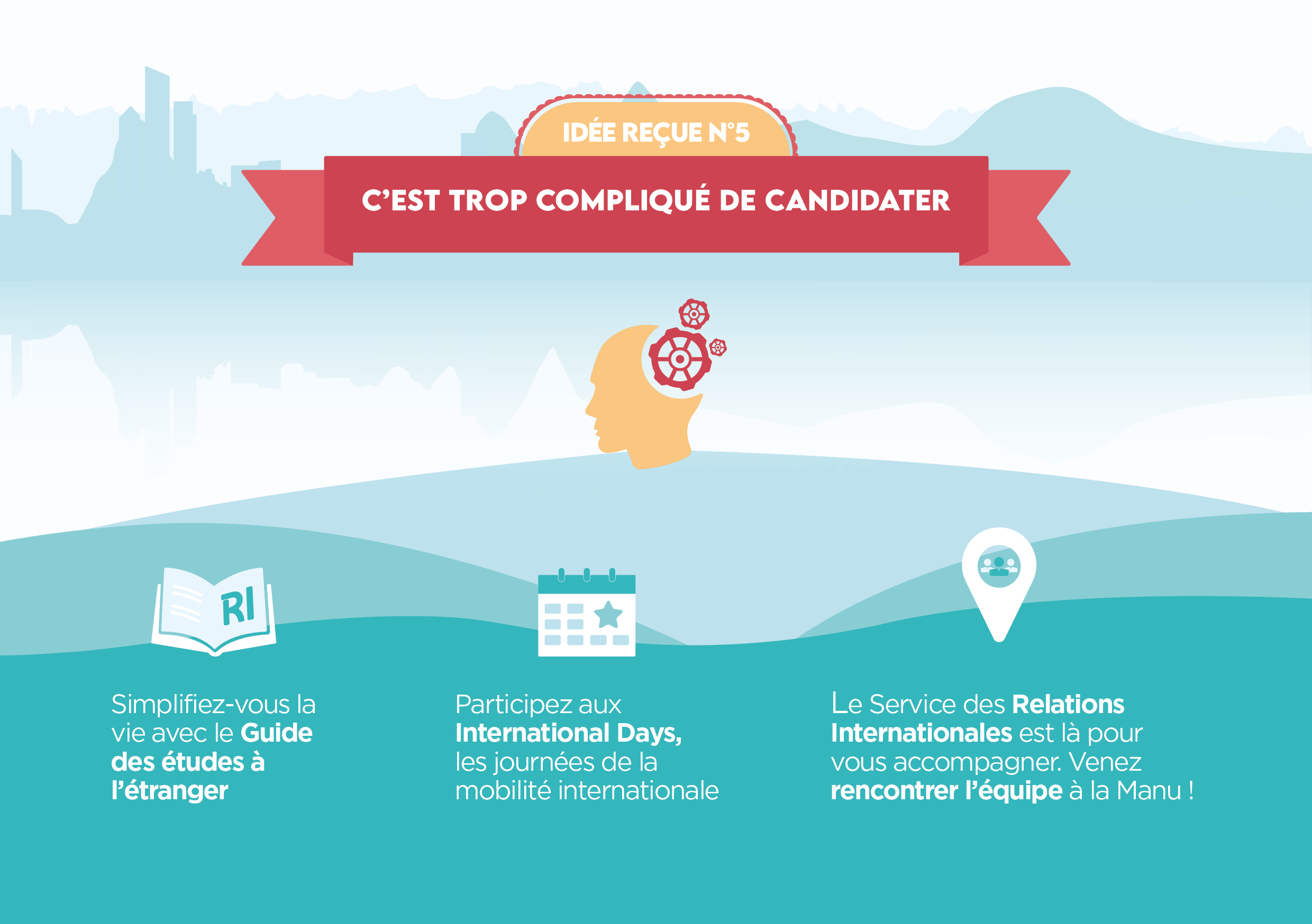 Séjour d’études, année de césure, stage, insertion professionnelle à l’étranger…. Vous avez un projet de mobilité à l’international ? Nous répondons à toutes vos questions pendant les International Days, venez nombreux !