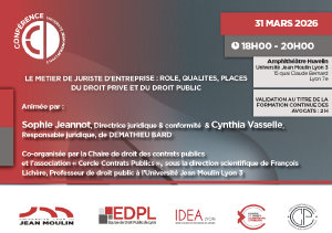 Le Cercle co-organise avec la Chaire de droit des Contrats Publics une conf¨¦rence sur le m¨¦tier de juriste d¡¯entreprise : r?le, qualit¨¦s, places du droit priv¨¦ et du droit public. Elle sera anim¨¦e par Sophie JEANNOT, Directrice juridique et conformit¨¦ ; et Cynthia VASSELLE, Responsable juridique au sein de la Soci¨¦t¨¦ DEMATHIEU BARD.Le m¨¦tier de juriste d'entreprise - Par Cercle Contrats Publics et la Chaire de Droit