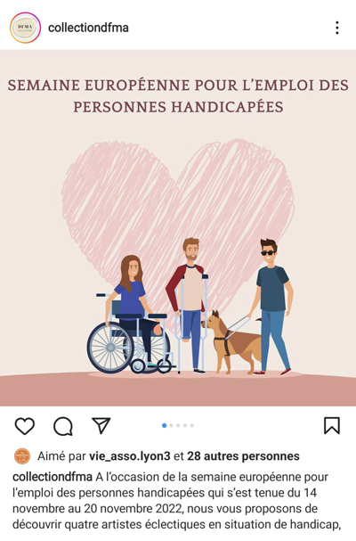 L'association DFMA Collection qui réunit les étudiants du Master 2 Droit et Fiscalité du Marché de l’Art a choisi de valoriser sur son compte instagram @collectiondfma, à l'occasion de la Semaine européenne pour l'emploi des personnes handicapées, un focus sur 4 artistes en situation de handicap : Ray Charles, Louis Joseph César Ducornet, Alice Sheppard, Dergin Tokmak.